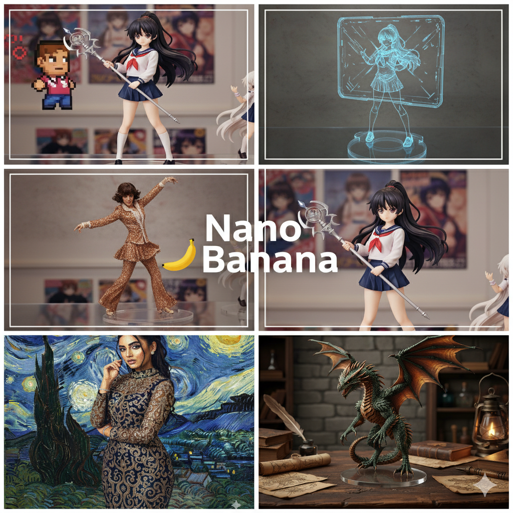 Become a character straight out of a Japanese animation. “A realistic 1/7 scale figurine of a cute anime girl, dressed in a detailed sailor-style school uniform, stands on a clear acrylic base. Her hair is tied back in a ponytail, and she holds a magical staff.”