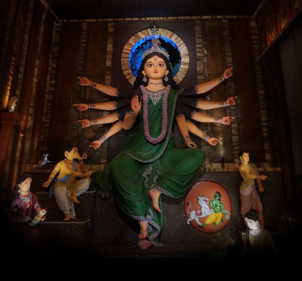Conceptualized by renowned artist Biman Saha, this year’s theme “Drishtikon” encourages visitors to experience colour not just as a visual element but as a medium of self-expression. Every shade in the pandal and on the goddess’s attire represents fragments of human thought, emotion, and philosophy, making the festival both visually stunning and intellectually inspiring.